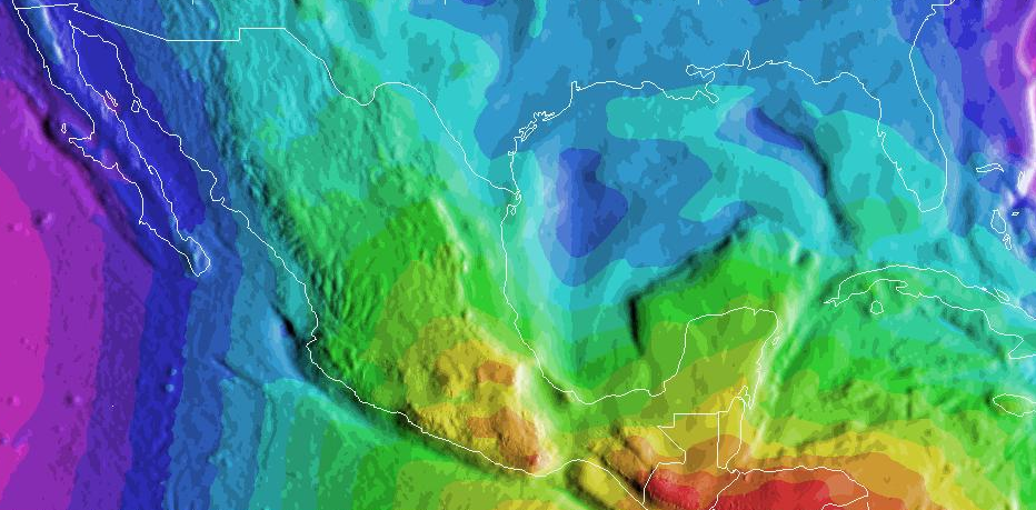 MEXICO97 fue creado en con la colaboracion de INEGI y es especificamente para Mexico. Los rangos de elevacion van desde -47.6 metros en el pacifico (magenta) a 6.8 en Honduras (rojo)